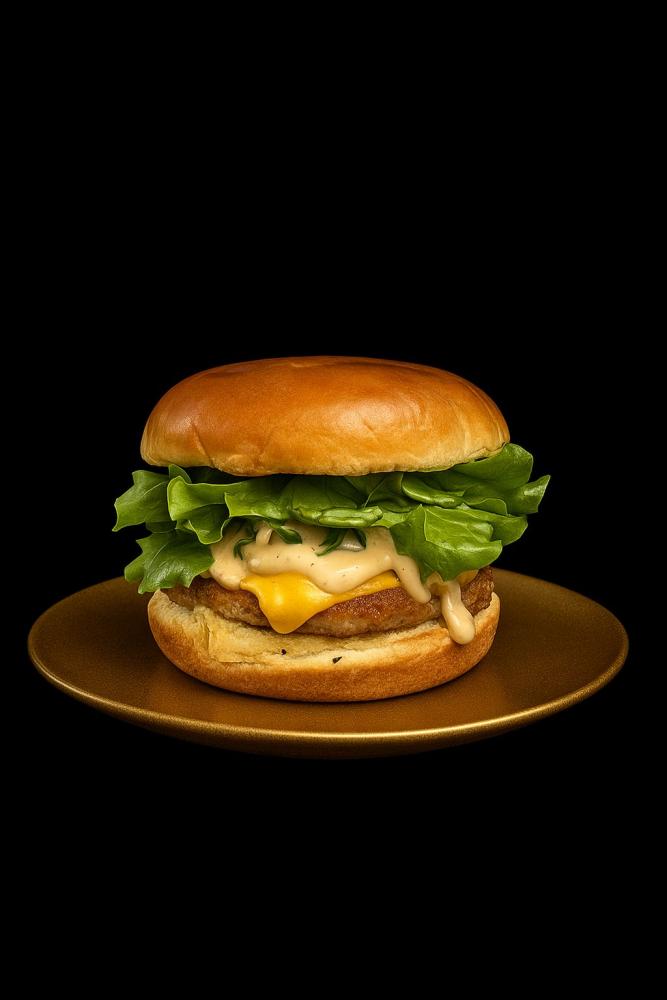 Pão brioche, frango empanado, queijo cheddar, molho tasty, alface e tomate